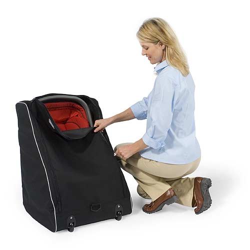 Why lug baby's heavy gear awkwardly through the airport, when you can comfortably pull it along? We added big, tough wheels to our car seat/booster travel bag for hassle-free toting — plus a new, ergonomic design so it's easier than ever! Front loading for easy packing; big enough to hold jumbo size equipment. There's even room for baby's blanket or coat! Rugged 600 denier poly, with built-in ID sleeve. Imported. A One Step Ahead Exclusive!. No need to carry your car seat or booster over your shoulder like with other travel bags; ours features rugged, easy-to-pull wheels . New ergonomic design allows you to pull our Car Seat Travel Bag with even less effort and greater comfort . Easier to load/unload than others; simply unzip the roomy front panel and place your car seat inside — no wrestling, no tugging . Extra-tough 600 denier poly fabric features a coated lining for extra-strength and moisture-resistance. Holds up to rough handling! . Sewn-in sleeve holds an I.D. or business card for easy identification . Folds easily for storage; later, use it to store patio chair cushions, etc. in the garage . Spot clean, air dry . Dimensions: 19"W x 29"H x 20"D, excluding wheels (holds even larger booster seats!)